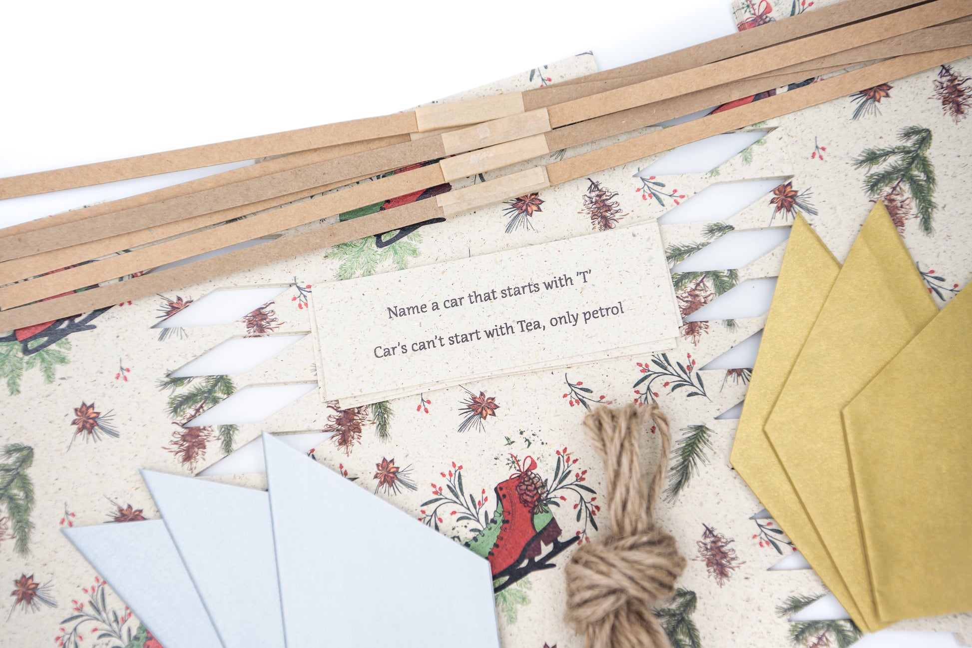 Each handmade UK kit includes everything you need to create six luxury crackers — complete with snaps, paper hats, festive jokes, and natural twine ties. Personalise them with your own small gifts or handwritten messages for a truly meaningful touch.